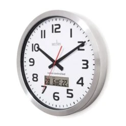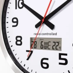 Modern and practical Radio Controlled wall clock combines analogue dial and synchronized LCD display with day, date and indoor temperature.