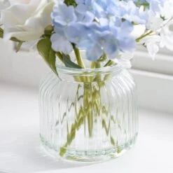 Enliven your home with the charm of our Artificial Hydrangea and Rose Bouquet in a Ribbed Glass Vase. The combination of blue hydrangeas and white roses, meticulously arranged in a clear ribbed vase, offers a highly realistic finish. With detailed leaves and intricate colouring, this maintenance-free arrangement is a perfect way to brighten your home, ensuring a lasting allure throughout the year.