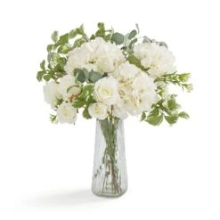This beautiful artificial bouquet features larger-than-life white peonies and is displayed in a gorgeous, sleek, and elegant vase.