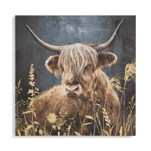 This partly hand painted canvas features Hamish, the loveable Highland Cow, depicted in a warm and earthy-toned palette. It has a wooden frame and is ready to hang. This canvas will bring an instant cosy atmosphere to your home and is perfect for an animal lover or country style interior.