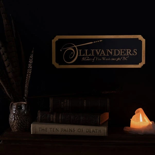 Ideal for Harry Potter fans of all ages, this plaque showcases a gold ‘Ollivanders’ title and metallic effect finish. It is completed by a gold wooden border and hook for wall display.