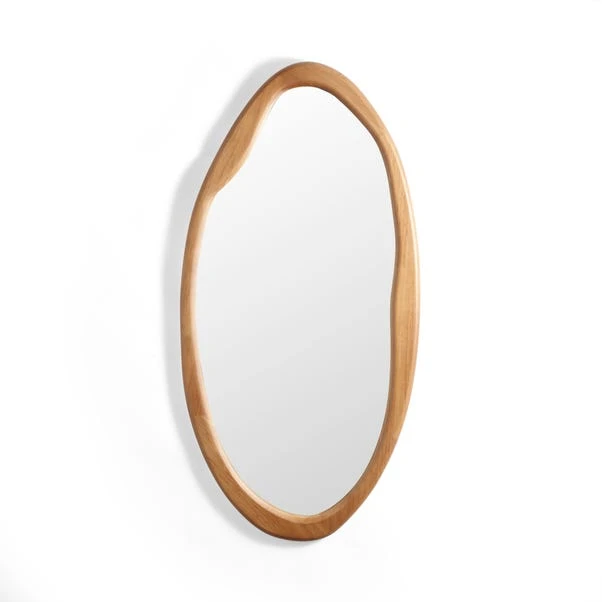 With a contemporary non-standard pebble shape, this mirror will add a modern and contemporary look in your home. The frame has been made from responsibly sourced rubber wood which will give this mirror a stylish, on trend design that will make a statement piece in any room. It comes complete with a D-ring hook attached at the back to simply hang on your wall.