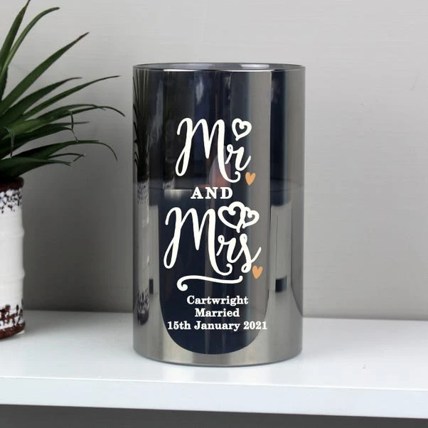 Personalised Mr and Mrs Smoked Glass LED Candle: Enhance the ambiance with this frosted glass LED candle, personalised with up to three lines of text. The candle features a realistic amber flame effect and operates on two AA batteries.